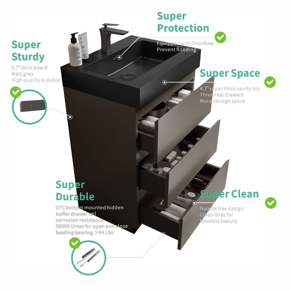 Alice 24" Gray Bathroom Vanity with Sink, Large Storage Freestanding Bathroom Vanity for Modern Bathroom, One-Piece Black Sink Basin without Drain and Faucet, Pre-assembled