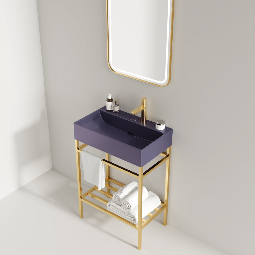 LOFI 24" Bathroom Vanity with Ceramic Basin, Freestanding Bathroom Console Sink Set, Glossy Purple Rectangular Ceramic Basin without Faucet, Open Metal Leg, Storage Shelves, Gold Color